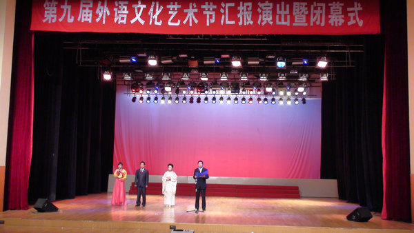 文艺汇演做为我院外语文化艺术节的压轴大戏,集各项比赛的精华为一体,历时3个小时,向学院全体师生汇报了第九届外语文化艺术节的优秀成果,有日语大合唱、影视配音、情景剧等,尤其是我校林佳贺同学在大连市政府和佳能大连有限公司联合举办的第21届“佳能杯”日语演讲比赛中获得一等奖的演讲更为精彩。汇演结束后,家长们对我校举办的外语文化艺术节给予了很高的评价,并且对我校学生的外语水平和表演能力深感认同。